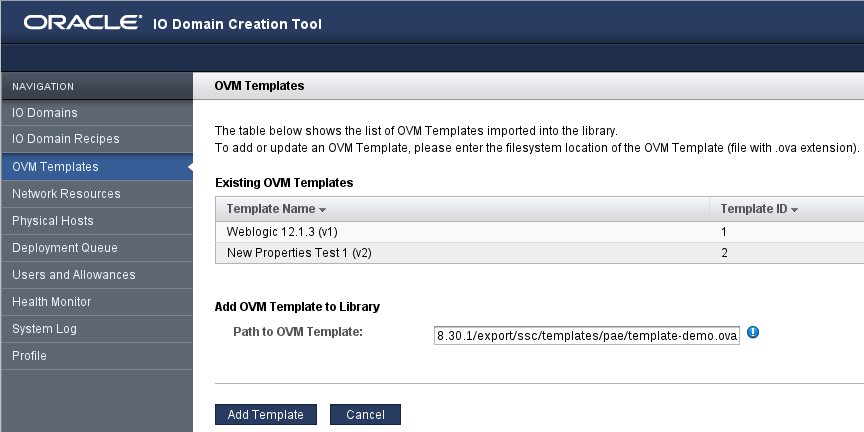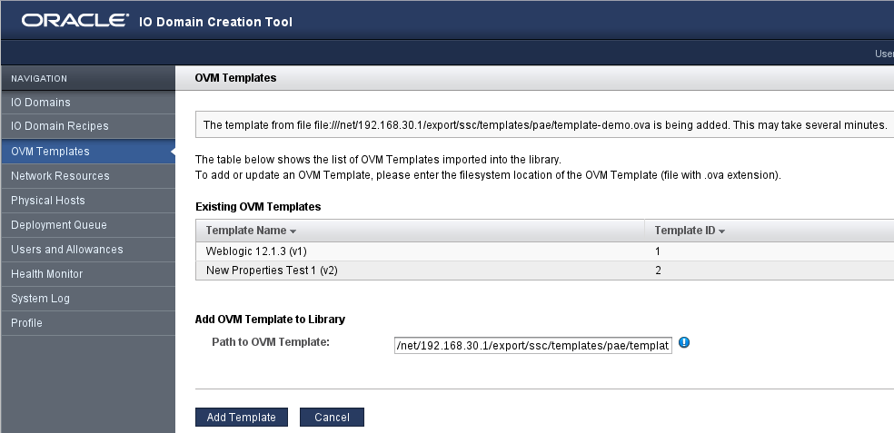 Um eine Domain mit einem neuen Template zu installieren, muss dieses daher erst einmal in die Bibliothek importiert werden. Damit das klappt, muss die Template-Datei irgendwo im Filesystem der Primary Domain des ersten Knotens des SuperClusters liegen. In unserem Beispiel ist das /net/192.168.30.1/export/ssc/templates/pae/template-demo.ova. Im IO Domain Creation Tool oeffnet man den “OVM Templates” Tab, gibt dort den vollen Pfadnamen der OVA-Datei ein und klickt auf “Add Template”. (Die Screenshots rechts werden lesbar, wenn man sie anklickt.)