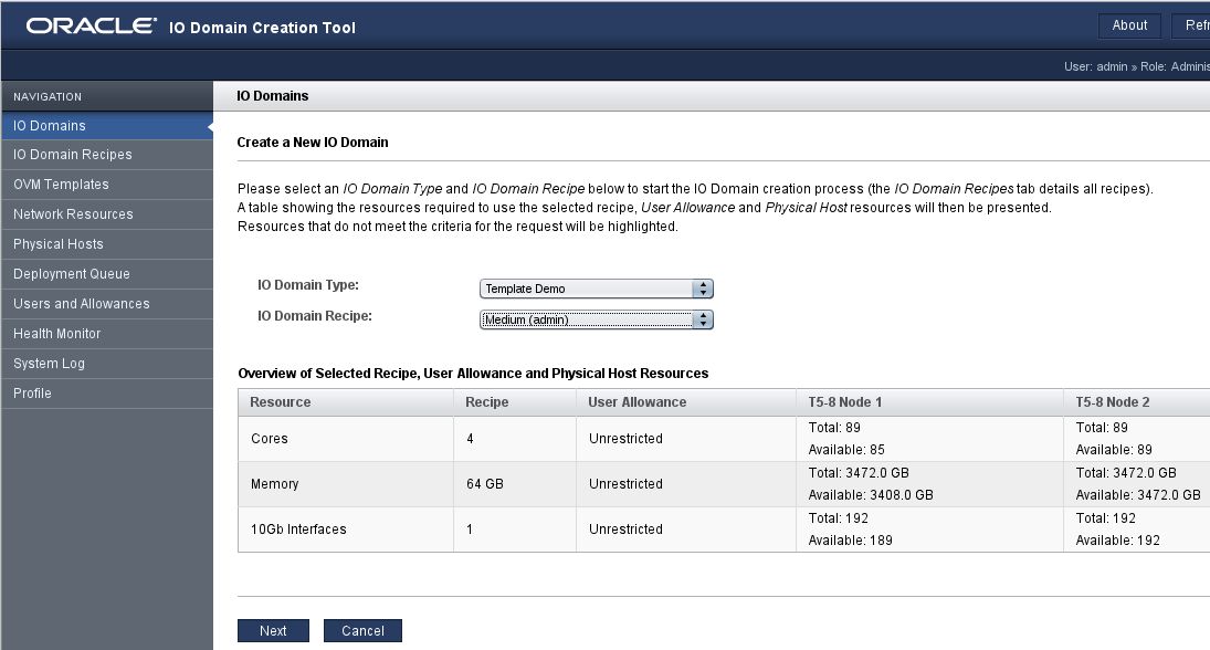 Wenn man Domains auf einzelnen Systemen installiert, werden sie anhand der Angaben im Template konfiguriert. D.h. die Anzahl der CPUs, die Groesse des Hauptspeichers und die Anzahl der Netzwerk-Interfaces, der Typ und der Speicherort der Disk Images werden alle entweder dem Template entnommen oder durch den Administrator bei der Installation mit angegeben. Auf SuperCluster wird all das durch das IO Domain Creation Tool kontrolliert: