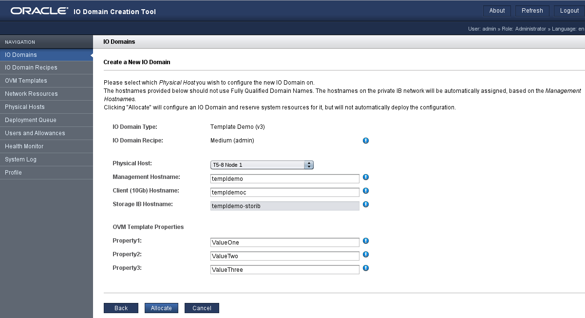 Nun wird man nach Angaben zu verschiedenen Eigenschaften der Domain gefragt. Manche davon sind bspw. Hostnames fuer diverse Netzwerk-Adapter. Diese sind SuperCluster spezifisch und werden unabhaengig von etwaigen Einstellungen im Template gesetzt. Abhaengig vom Template gibt es evtl. weitere Eigenschaften, deren Werte hier angegeben werden koennen. In unserem Beispiel werden die drei Eigenschaften abgefragt, die zuvor definiert wurden. Wenn alles stimmt, kommt man mit “Allocate” wieder zurueck zur Domain-Uebersicht. Die Hardware ist jetzt fuer die Domain reserviert.
