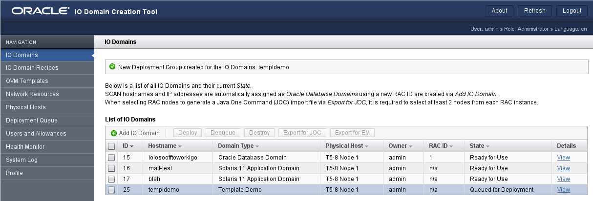 Dieses “IO Domain Creation Tool” verwaltet alle Aspekte des Lebenszyklus einer IO Domain. Das ist ein neuer Typ von Domain die in der Version 2.0 der SuperCluster Software eingefuehrt wurde. Mit dem Tool und den IO Domains werde ich mich hier nicht weiter beschaeftigen. Interessierte finden die Details in der offiziellen Dokumentation. IO Domains koennen jedoch auch mittels eines Templates installiert werden, und darum soll es hier gehen.