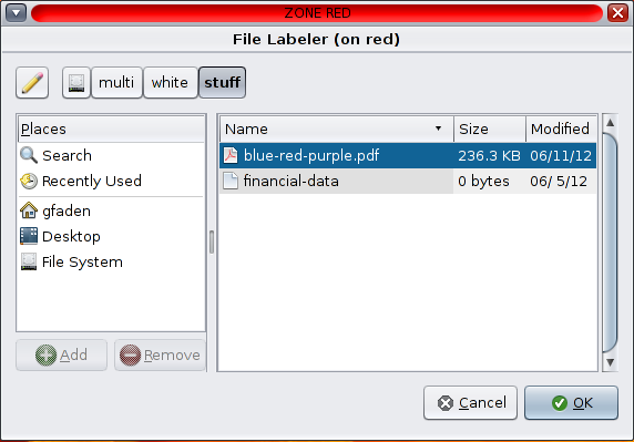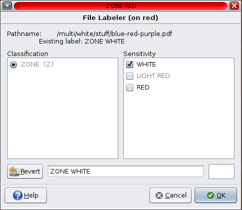 I’ve written a labeldemo shell script that can be used to try out this new feature. Although it implemented using ksh, it uses two GNOME applications to provide GUIs for file selection and relabeling. The file selection uses zenity(1) and the relabeling uses the tgnome-selectlabel utility. The demo can be run in either the global zone or in a labeled zone using the Trusted Desktop.