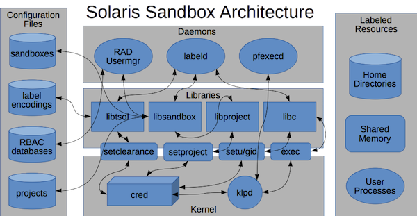 The following diagram provides an architectural overview of Oracle Solaris sandboxing, very few people need to understand this but it shows how it fits into the existing Oracle Solaris security architecture: