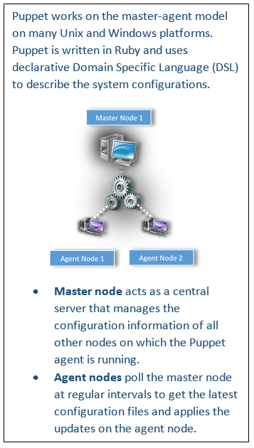 Puppet is also a very capable tool within the DevOps framework for faster application deployments. The whole idea of being agile while automating the entire software delivery cycle is a very real scenario with Puppet. The merits of which translate into consistency, increased reliability, and decreased cycle times.