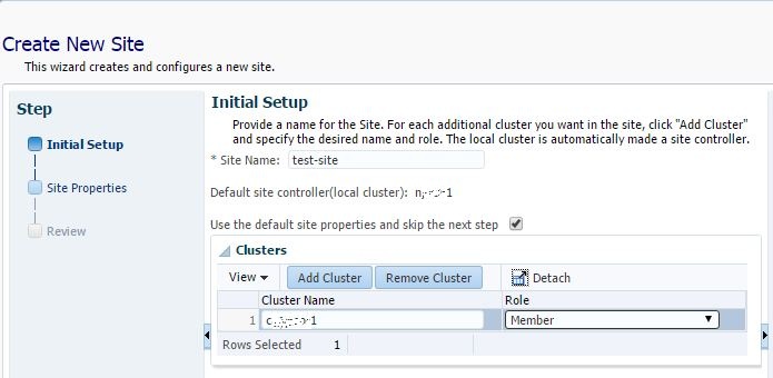 - In the Initial Setup step, enter the Site Name. The role of the current cluster is controller by default. Click the Add Cluster button to add more clusters. Enter the name of the cluster in the table below the button and the role of the cluster. To skip the next step and use the default site properties, check the checkbox.