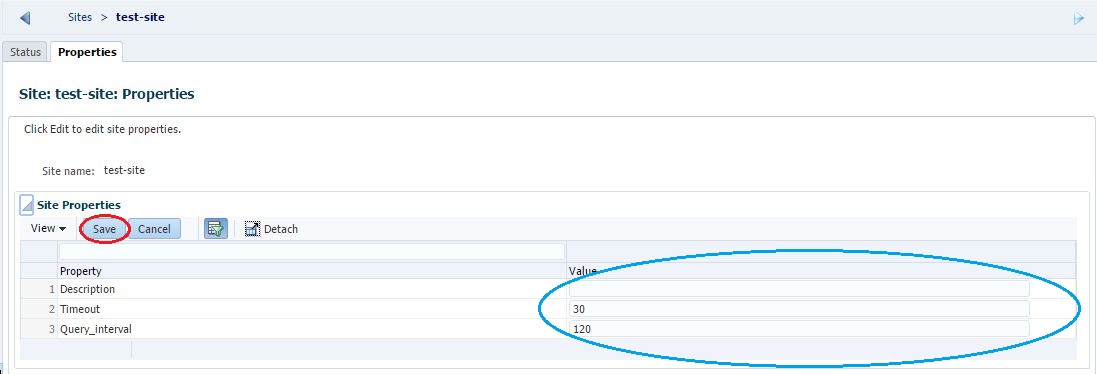 - The area with the Edit button now have Save and Cancel button. The value column changes into editable fields wherever applicable(encircled in blue). Make the changes and click the Save button.
