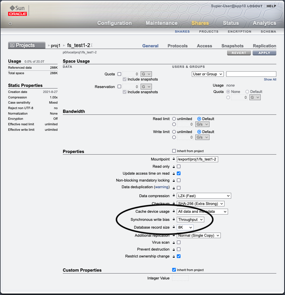 - Synchronous write bias : Throughput is a dataset mode that reduces the number of I/Os that need to be issued on behalf of this dataset during the regular transaction group updates leading to more leveled response time.