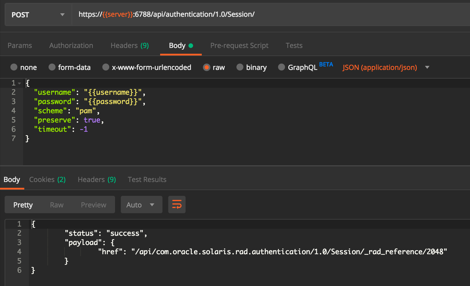 Note I’m using centrally set variables {{server}}, {{username}}, and {{password}} in the URL and the JSON payload, in part to obscure them but most importantly if I want to connect to a different server or connect under a different user ID I can change it once and all my URLs and payloads are updated where appropriate. Equally if you use a Postman test run you can load these in to fit your test.