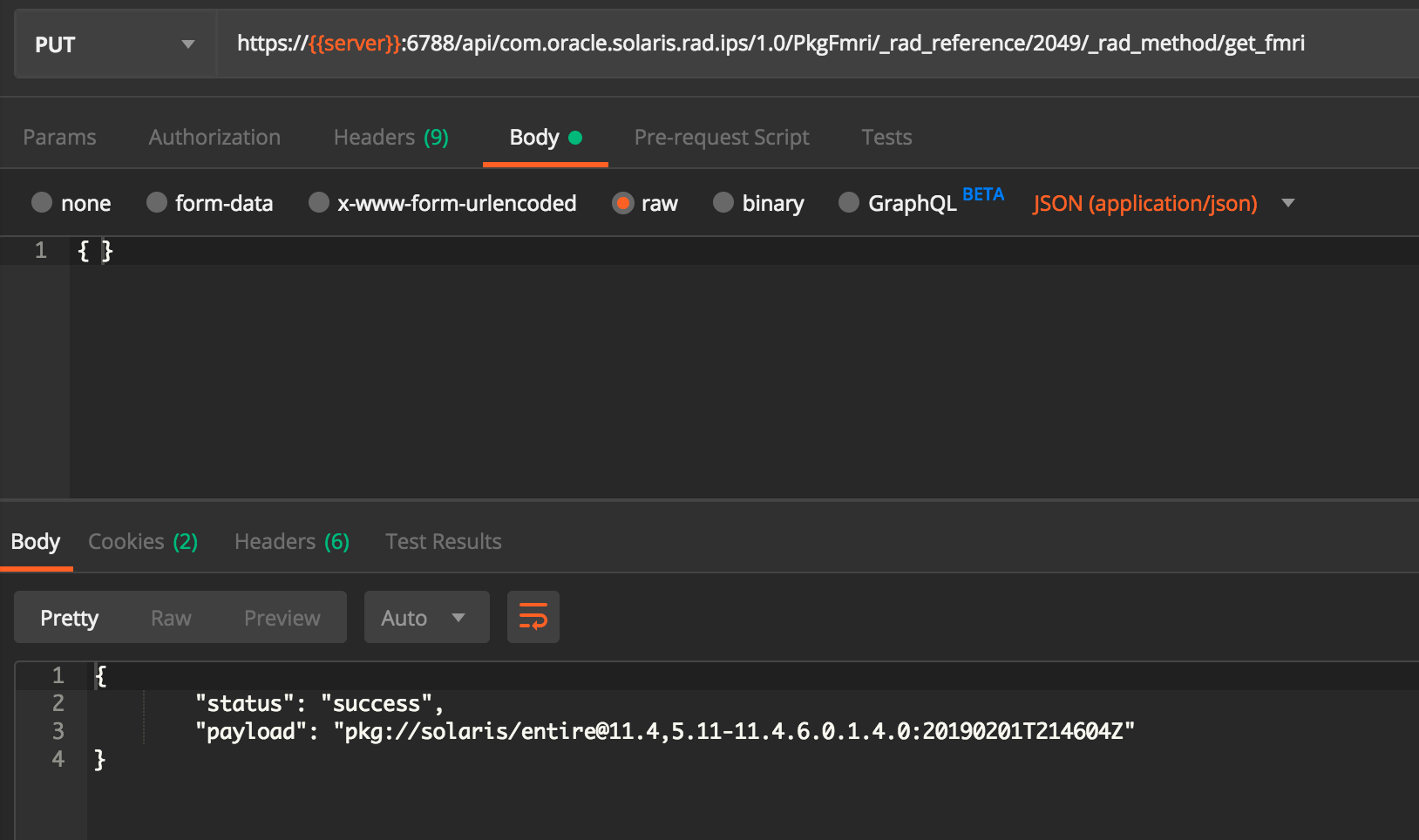 On the PkgFmri interface we also have individual methods to get specific piece of information, so for example if we use this URI: With a PUT and an empty JSON payload ({ }) the response is: You can see that we’re running 11.4 SRU 6 in on this system. By the way, this interface only gives information which is stored in the package FMRI like the package name, the publisher, the version, the timestamp, and things like that. In the examples above I’ve essentially started with the PkgImage interface and then used the RAD methods info and list_packages as ways to start looking for packages. This can be refined by altering the JSON payload you send with the PUT call. I’ve only used one — "pkg_fmri_patterns" — but there are many others that you can use with the different methods. For example with the info methods I can use "info_local": <boolean> and "info_remote": <boolean> to refine my search to either on the system or in the repository. Similarly the list_packages methods has "list_upgradable": <boolean> to give you a list of packages that are upgradable, which is equivalent to the CLI pkg list -u option. So there’s much more you can do with this than I’ve shown. With that I’ll close off. There are other things like installing and uninstalling packages as well as initiating a package update, and changing the package publisher. But these will have to wait for a future blog post. Enjoy./api/com.oracle.solaris.rad.ips/1.0/PkgFmri/_rad_reference/2049/_rad_method/get_fmri