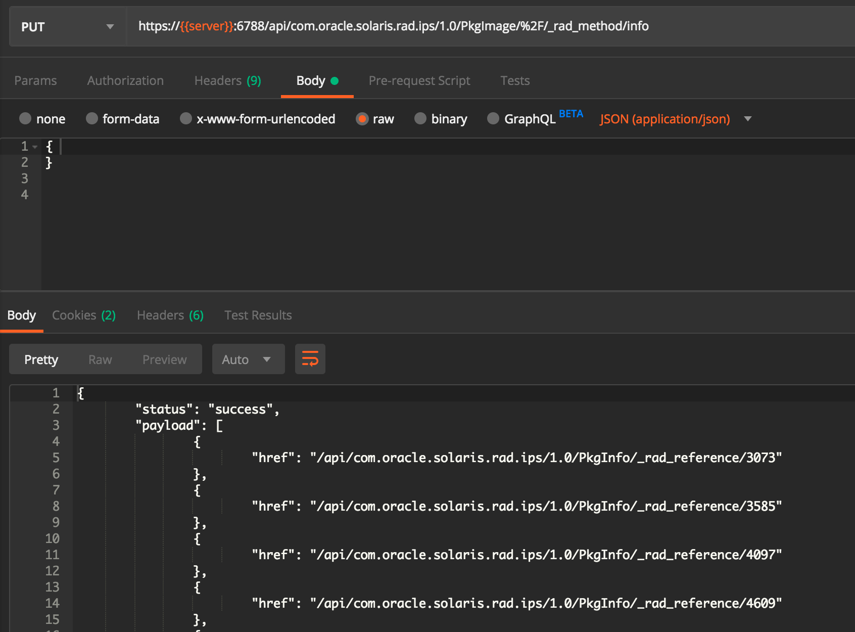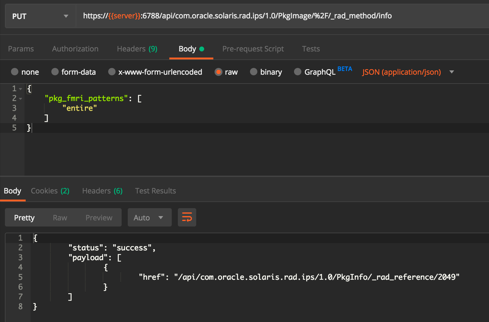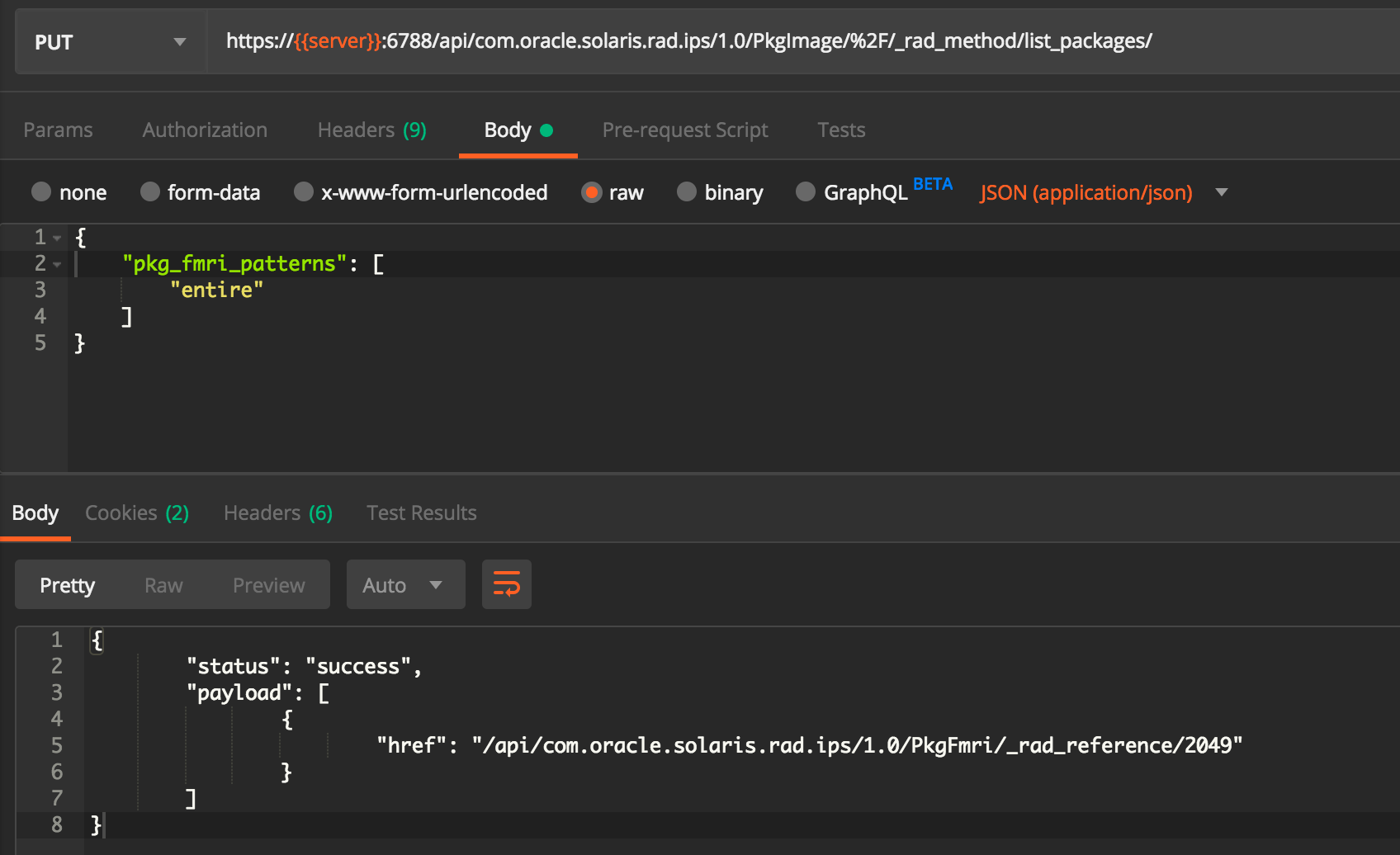 { "status": "success", "payload": [ { "href": "/api/com.oracle.solaris.rad.ips/1.0/PkgInfo/_rad_reference/2049" } ] }