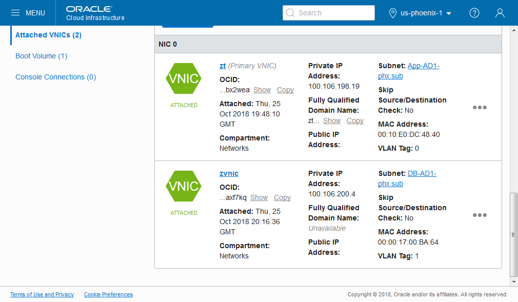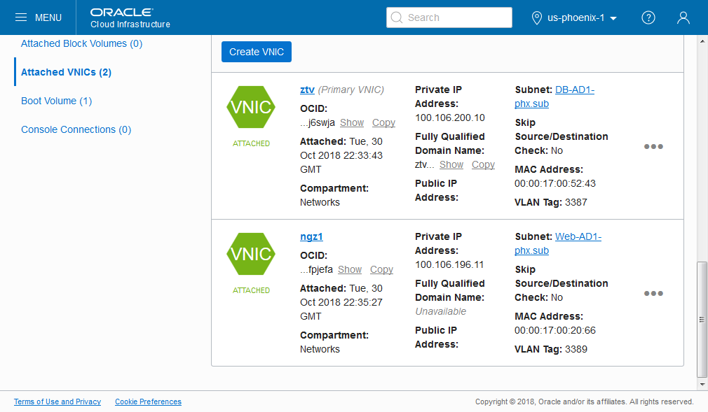 Next, you’ll need to use the OCI console or CLI add a second VNIC to the instance that we’ll use for the zone’s network access. When you’re done, the instance’s Attached VNICs section in the OCI console should look something like this: