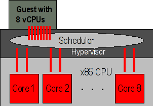 The SPARC hypervisor, when creating guest systems, simply assigns a certain number of these threads exclusively to one guest, thus avoiding the overhead of having to schedule OS threads to CPUs, as do typical x86 hypervisors. The hypervisor only assigns CPUs and then steps aside. It is not involved in the actual work being dispatched from the OS to the CPU, all it does is maintain isolation between different guests.