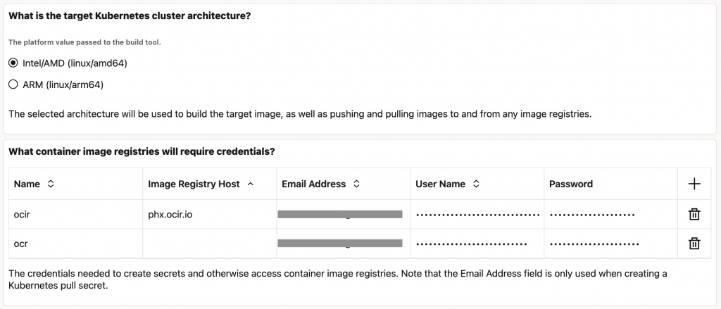 You can now explicitly specify the target Kubernetes cluster architecture (for example, Linux on Intel/AMD) independent of the WKT UI host machine’s architecture. This addresses compatibility issues—such as running WKT UI on Apple Silicon Macs while targeting x86-based Kubernetes clusters (e.g., Oracle Cloud Infrastructure Kubernetes Engine). - Centralized Container Registry Credentials: