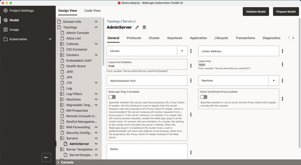 A brand new WDT model editor lets you create and edit your WDT model files. This replaces the previous WebLogic Remote Console integration, aligning editing tasks with WDT MBeans and streamlining management of WDT Archives and Variables files.