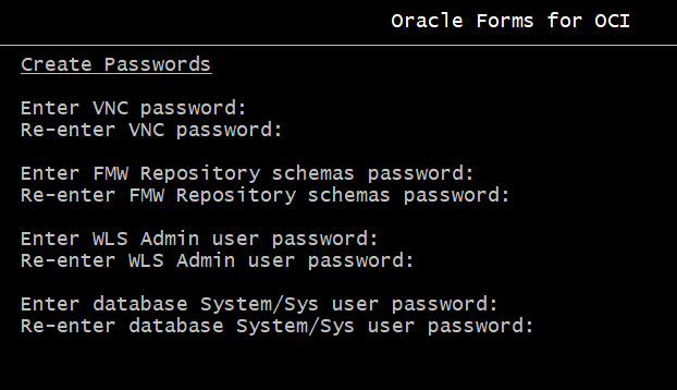 On the first-time login, you will be asked to provide DB information and passwords to configure VNC server, FMW repository schemas, WebLogic and Database.