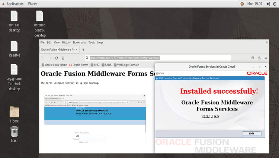 After the initial setup finish the creation of the Forms domain, a VNC client can be used to access the instance as oracle user using GUI or use secure shell (ssh) to login as opc user.